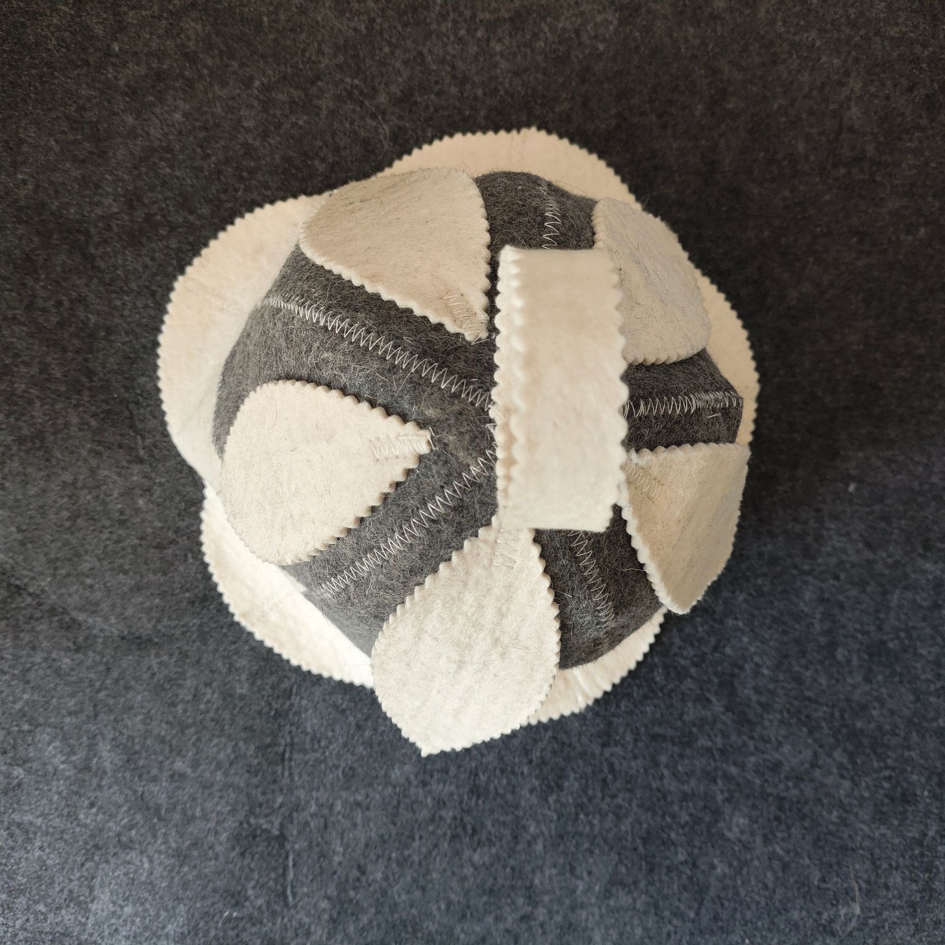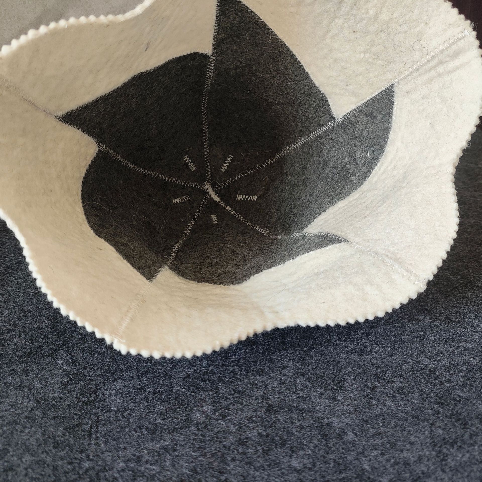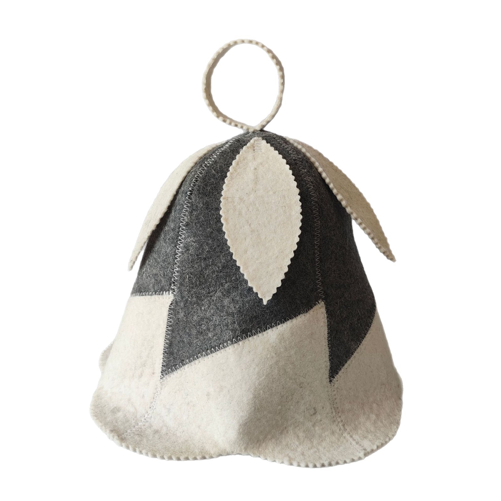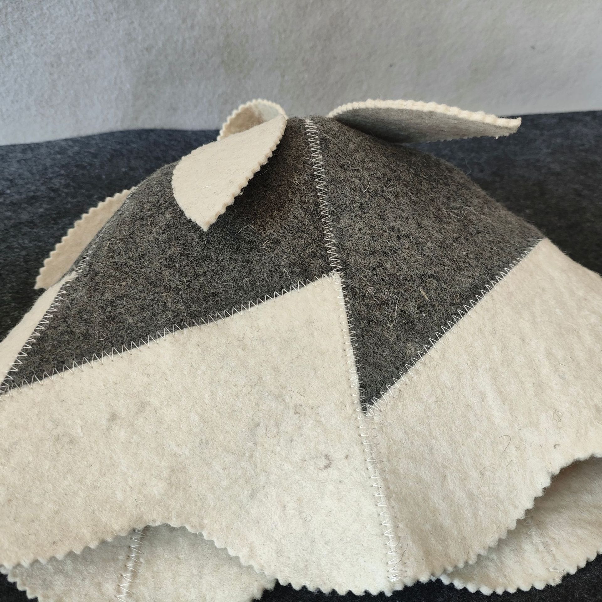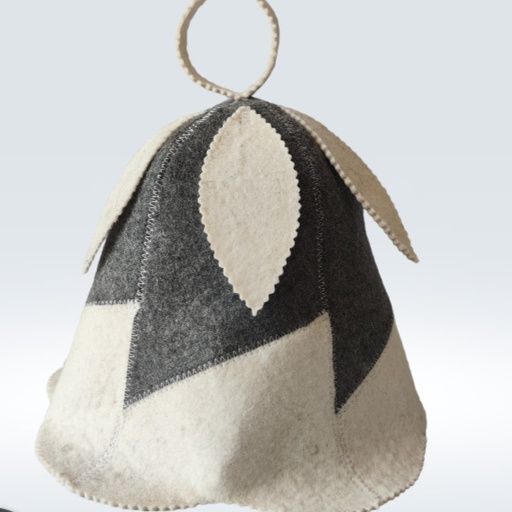 パッチワーク仕様のサウナハットです。 幾何学的な切り替えデザインが個性的で、サウナ室でも目を引くおしゃれなアイテムに仕上がっています。 厚手の毛氈生地が頭部をしっかり保護し、熱から髪や頭皮を守ります。 上部には便利なループ付きで、使用後の乾燥や収納も簡単です。 サウナグッズとして本格的な温浴体験を楽しみたい方におすすめの一品です。
