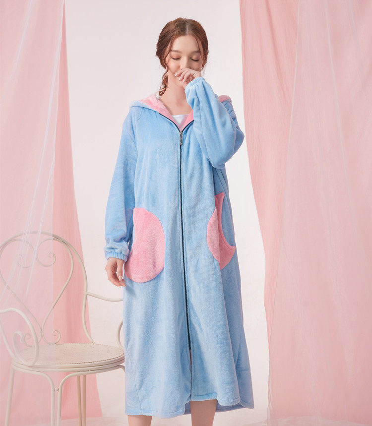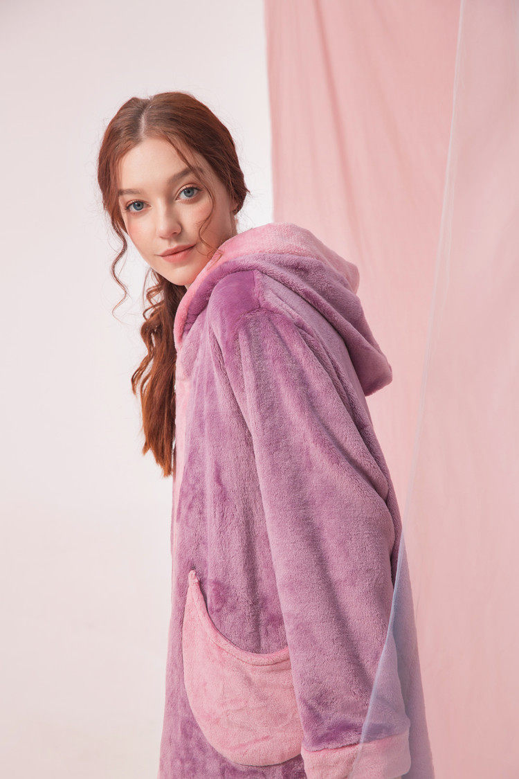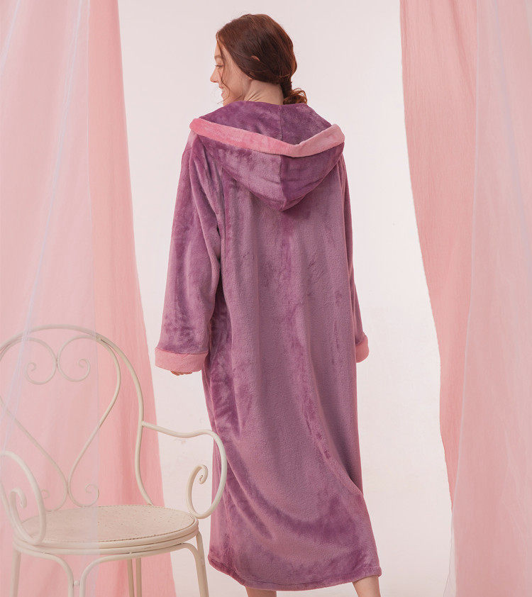 フード付きで髪の毛の水分もしっかりケアでき、ゆったりとしたロング丈が全身を温かく保護します。