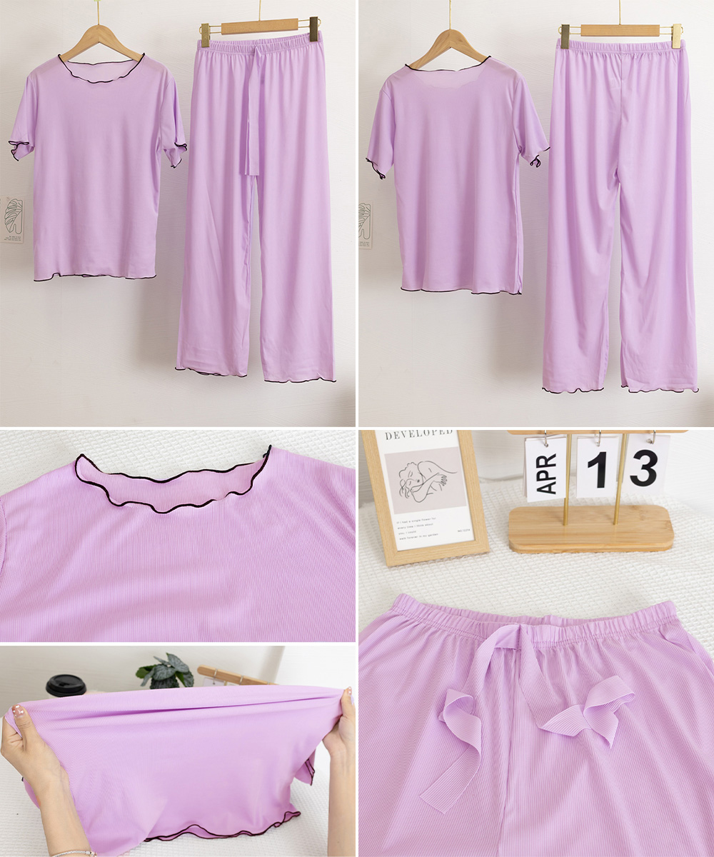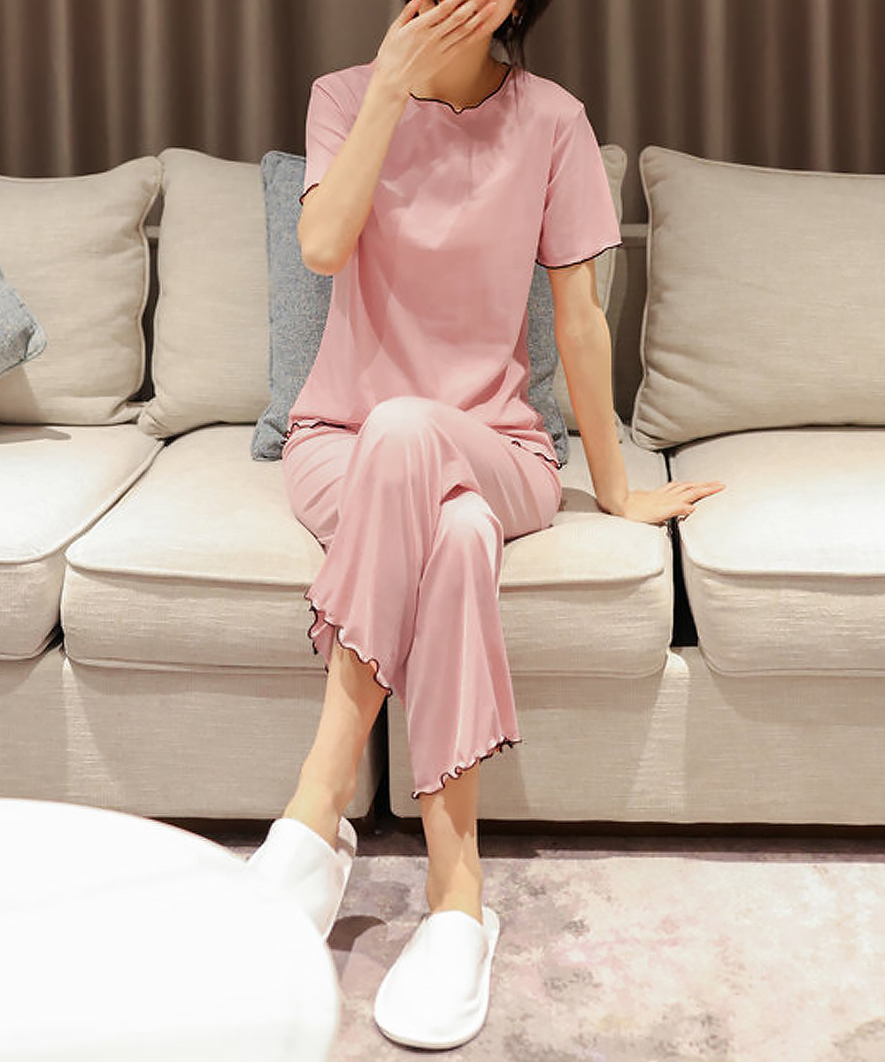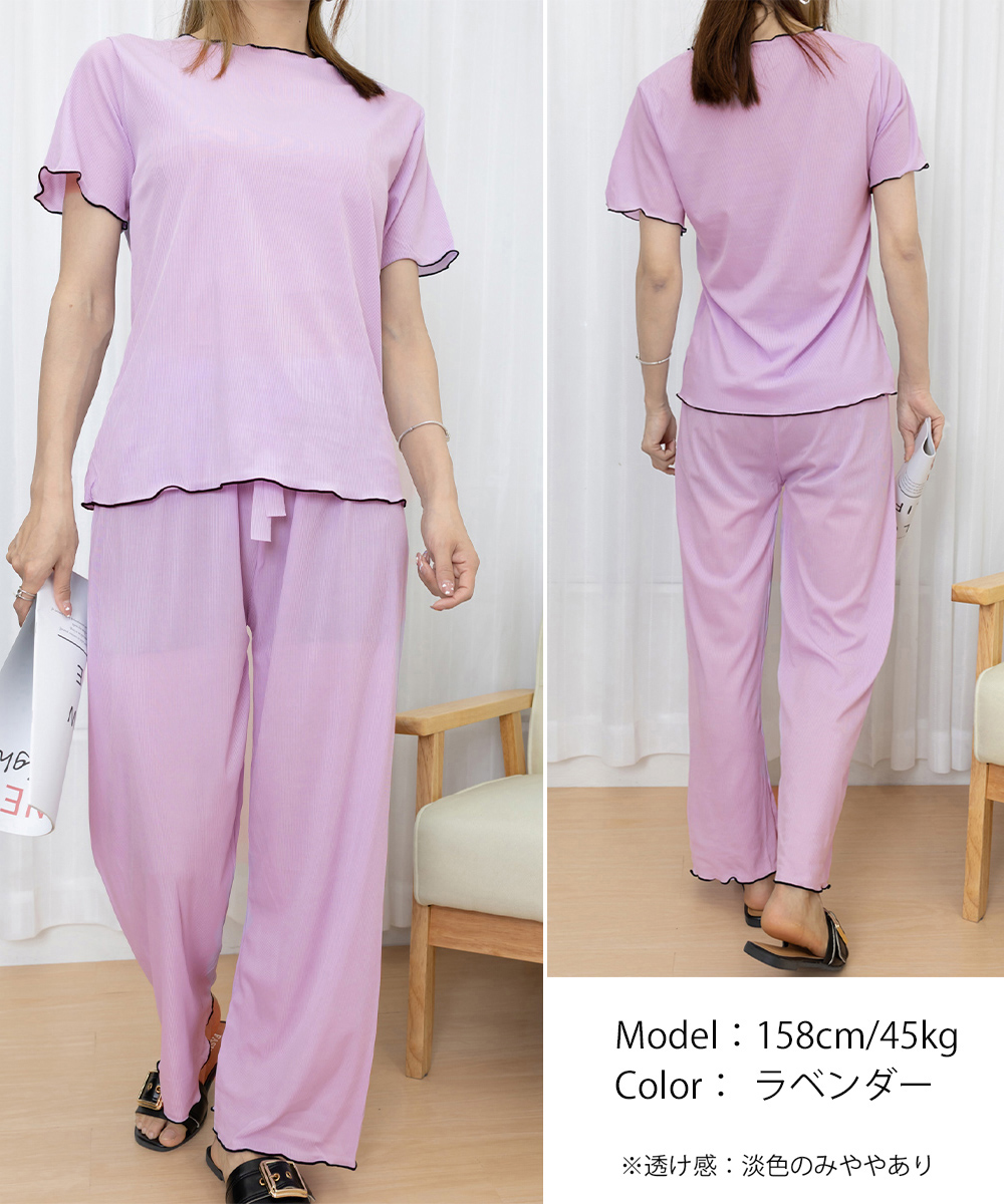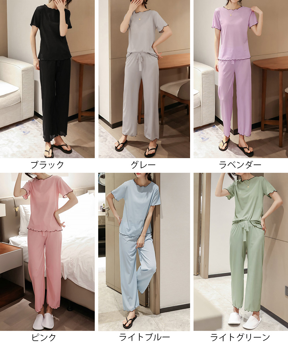 カラー:ブラック/グレー/ラベンダー/ピンク/ライトブルー/ライトグリーン サイズ:ワンサイズ トップス: 着丈:約61cm 肩幅:約37cm 袖丈:約18cm ゆき:約36.5cm 身幅:約44cm 胸囲:約88-100cm ボトムス: 着丈:約90cm 股下:約59cm ウエスト(ゴム仕様):約60-100cm ヒップ:約102-120cm もも周り:約56-64cm 裏地:なし 伸縮性:あり 透け感:淡色のみややあり