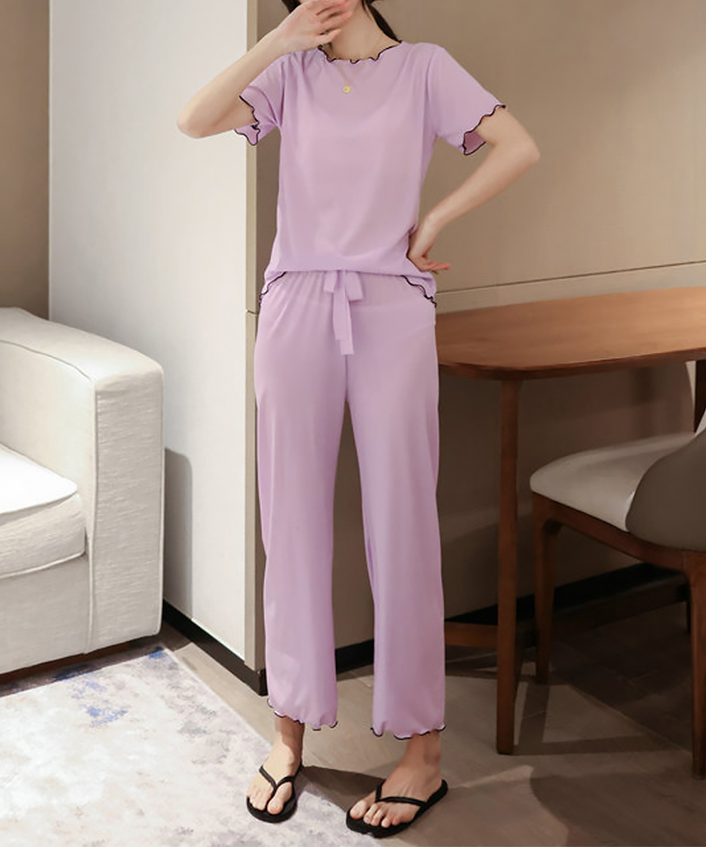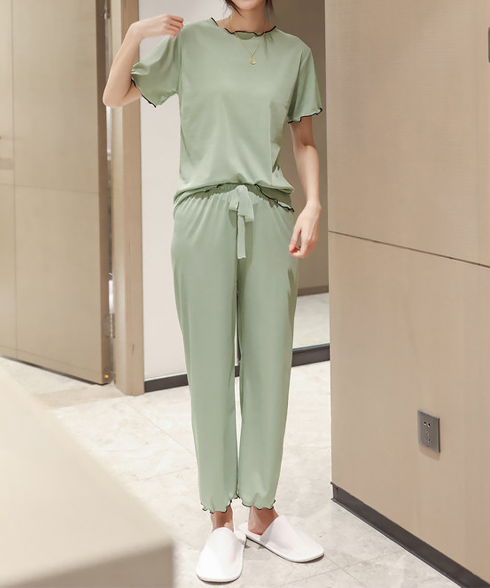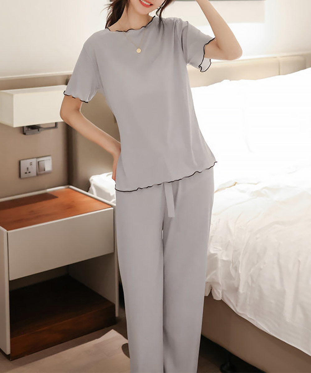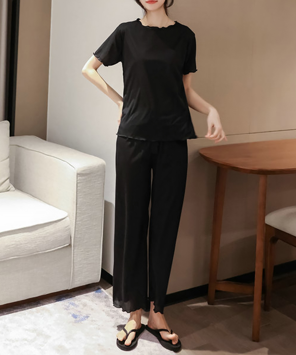 カラー:ブラック/グレー/ラベンダー/ピンク/ライトブルー/ライトグリーン サイズ:ワンサイズ トップス: 着丈:約61cm 肩幅:約37cm 袖丈:約18cm ゆき:約36.5cm 身幅:約44cm 胸囲:約88-100cm ボトムス: 着丈:約90cm 股下:約59cm ウエスト(ゴム仕様):約60-100cm ヒップ:約102-120cm もも周り:約56-64cm 裏地:なし 伸縮性:あり 透け感:淡色のみややあり